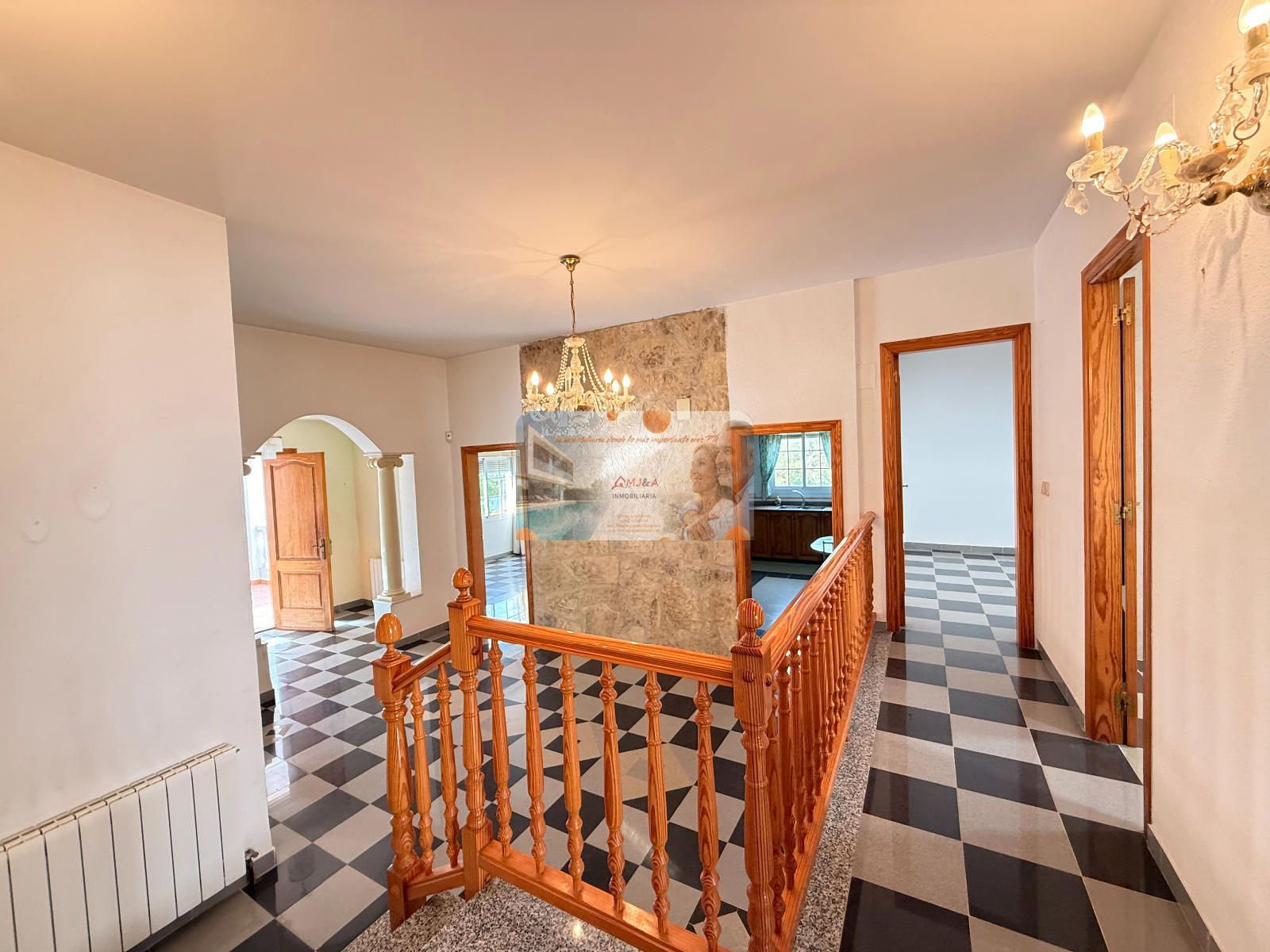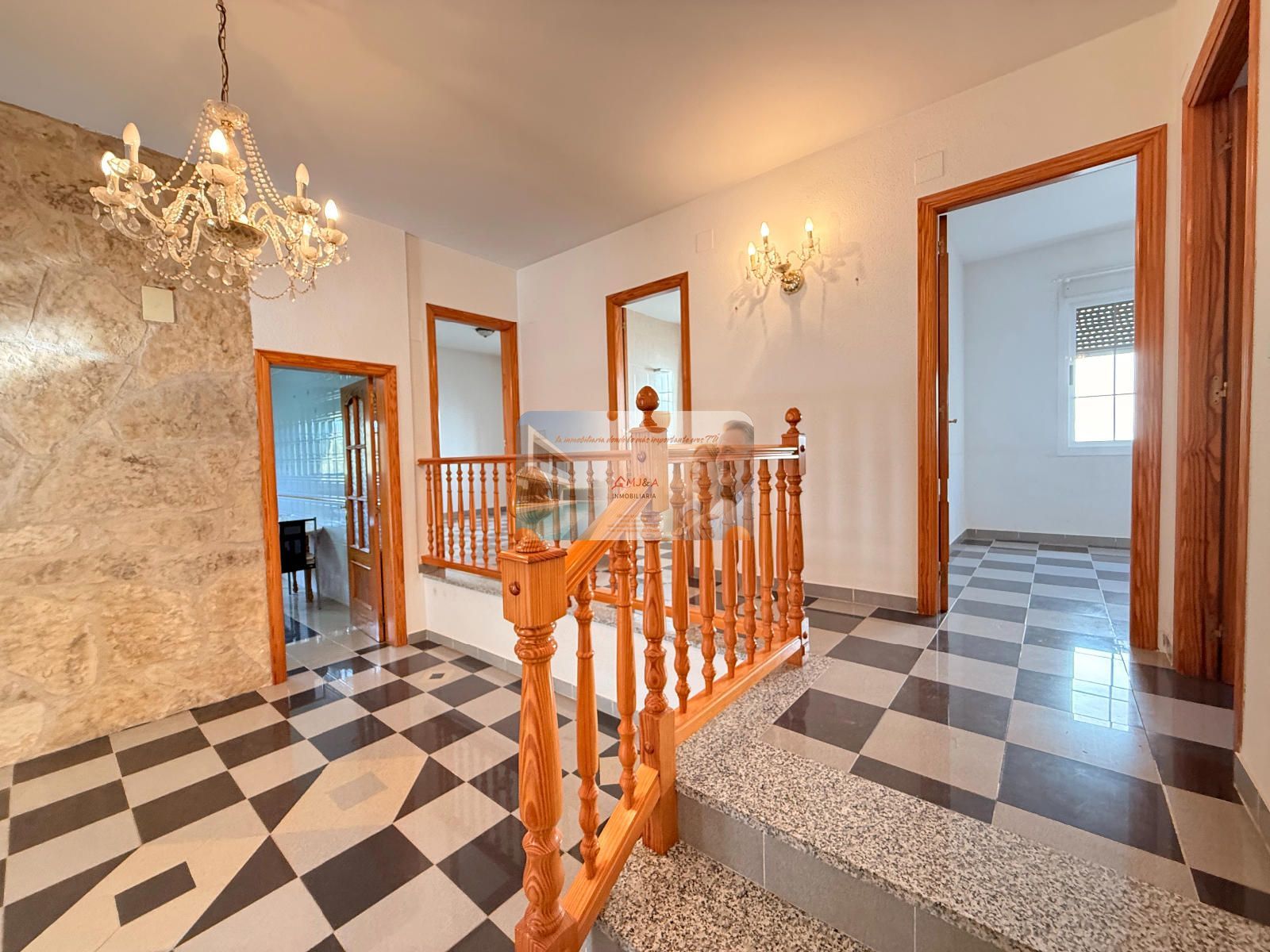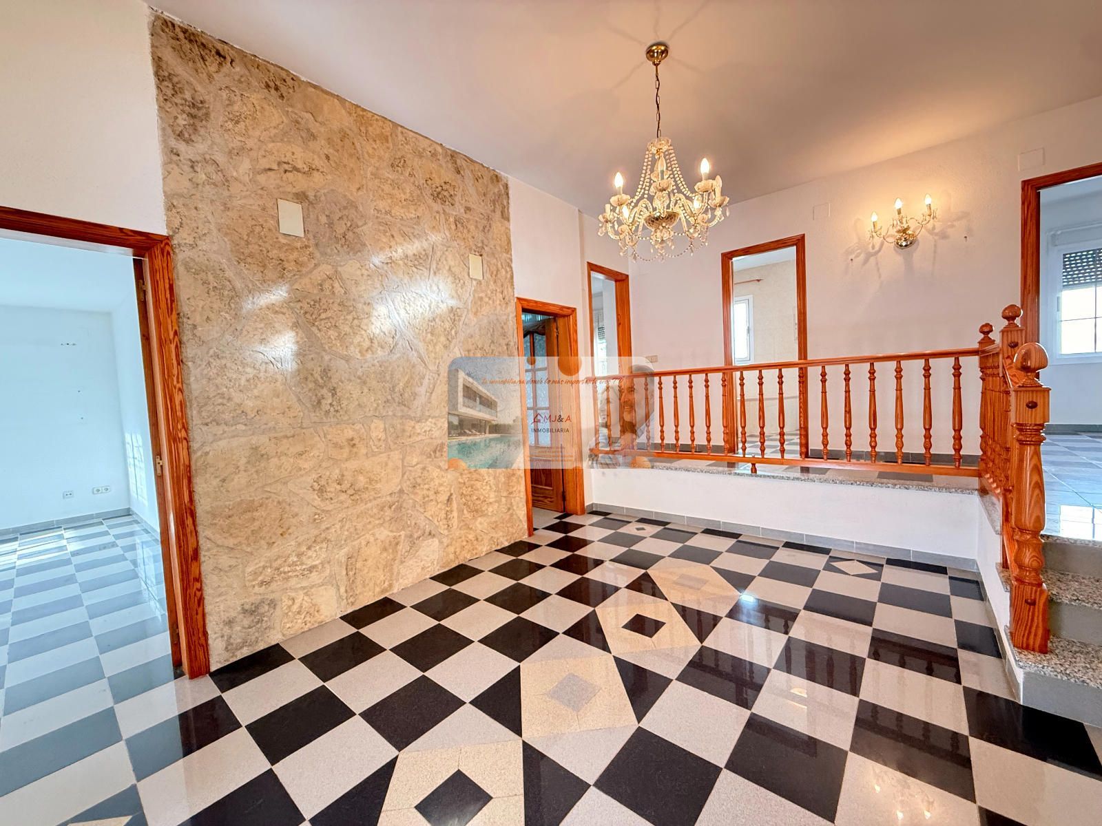 En la primera planta se encuentra la vivienda principal, diseñada con una distribución muy cómoda y funcional. Dispone de cuatro amplias habitaciones, dos baños completos, uno de ellos en suite, un gran salón con chimenea que aporta calidez y carácter, y una espaciosa cocina con muchas posibilidades. Toda la planta gira en torno a un magnífico vestíbulo distribuidor, que aporta amplitud visual y una organización muy práctica de los espacios.